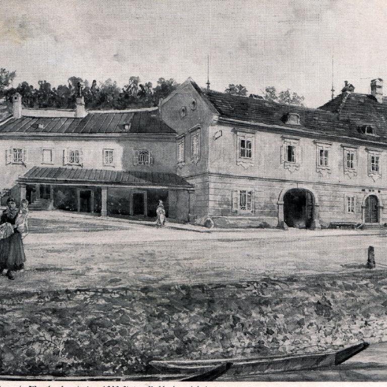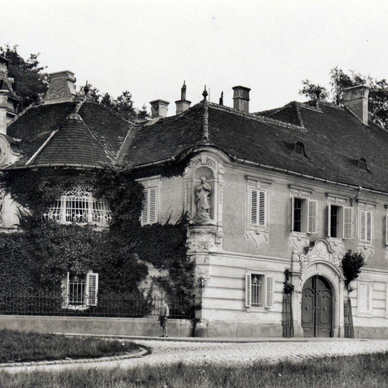 Here were formerly three separate Biedermeier houses dating to the early 19th century. These were acquired by the owner of a lime kiln and stone quarrying business, Leonhard Kamptner, and combined to form the villa. Through the marriage of Anton Poschacher jun. to Kamptner’s daughter Aloisia in 1839, the villa became the property of the Poschacher family. In 1903, the villa was completely rebuilt, acquiring the Neo-Baroque appearance it now has.