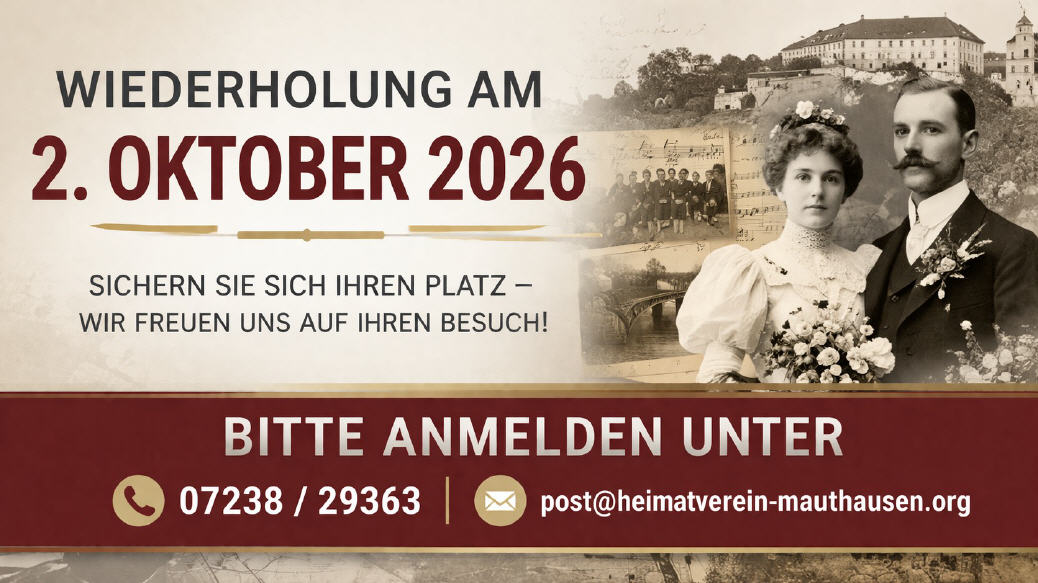 02.10.2026: Vortrag: GRANIT & GLORIA – Eine Mauthausener Lebensreise von 1850 bis 1936 Vortragsraum Schloss Pragstein (2. OG) • Sa. 21. März 2026 – 19.30 Uhr • Fr. 2. Okt. 2026 – 19.30 Uhr (Wiederholung) Christoph Lettner und Alfred Hochedlinger erzählen die Lebensgeschichte des Mauthausener Bürgermeisters Franz Perger (1868-1935), musikalisch untermalt vom Gesangsensemble VOCALISTA Wegen der großen Nachfrage und des begrenzten Platzangebotes ist eine Anmeldung unbedingt erforderlich! Tel: 07238 29363 oder Mail: post@heimatverein-mauthausen.org